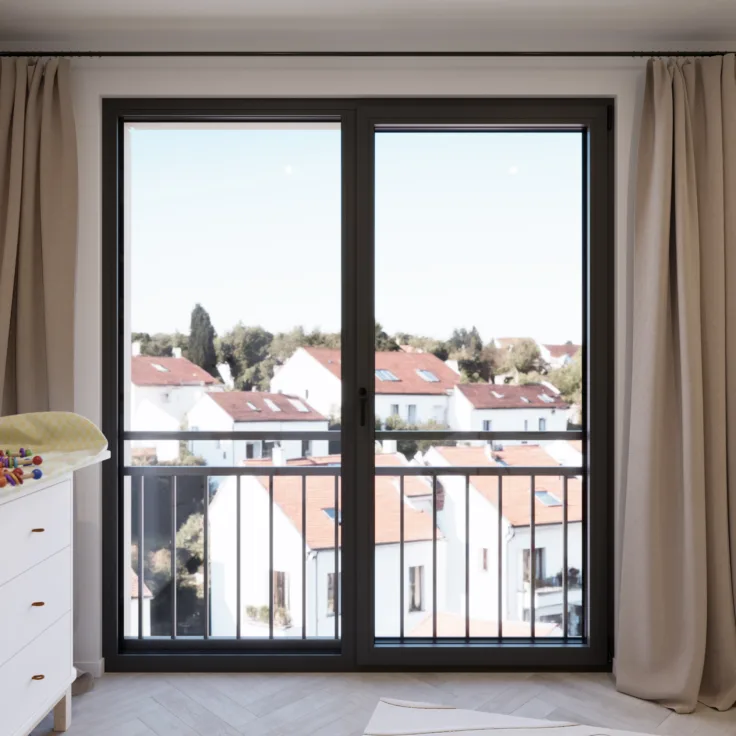 Ventana Schüco Symbiotic, de una hoja con fijo lateral, hasta el suelo con protección contra caídas mediante barras vertical