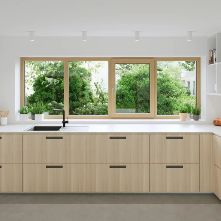 Utvändigt Schüco UnlimitedFinish Alux DB 703/invändigt Schüco UnlimitedFinish ek natur FL-G